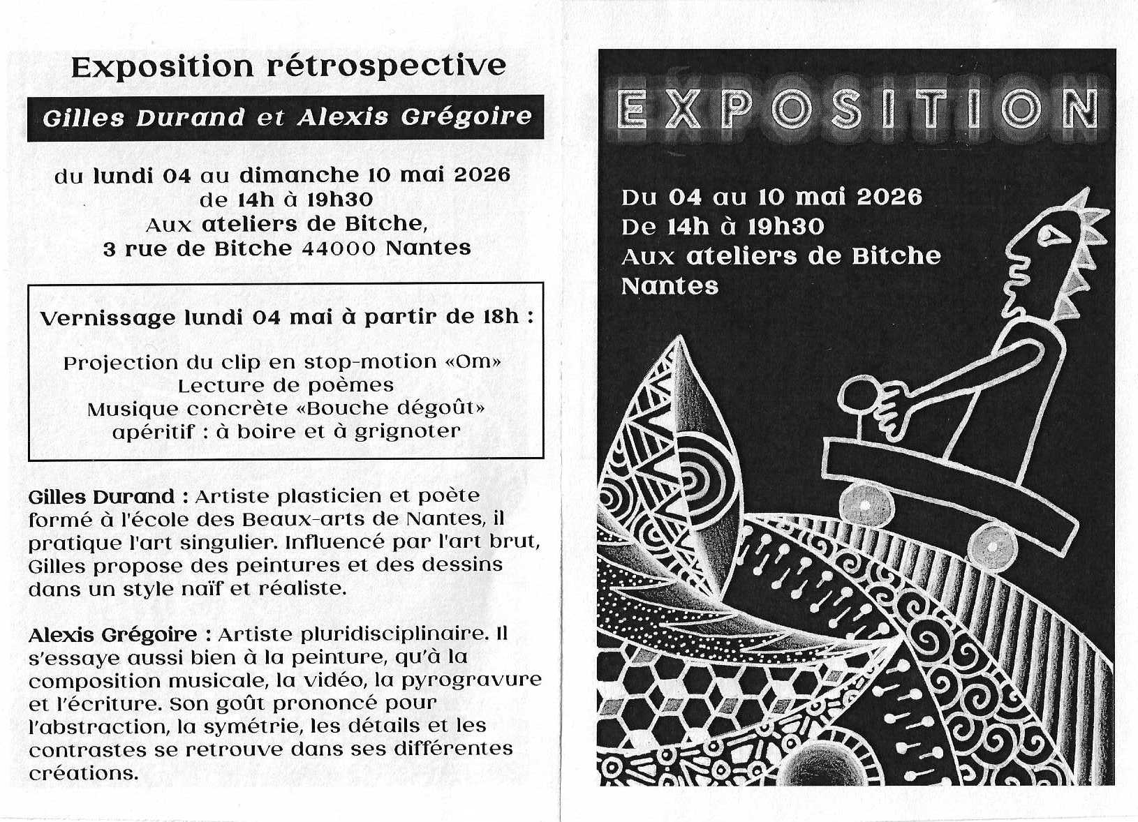 « Tous les événements Exposition Alexis Grégoire et Gilles Durand – peinture, dessins, poésie, vidéo, son… 4 mai de 14 h 00 min à 10 mai de 19 h 30 min | prix soutien Navigation de l'événement « CABARET PLAISIR BURLESQUE + Google Agenda+ Exportation iCal Détails Début : 4 mai 04+01:00 14 h 00 min Fin : 10 mai 10+01:00 19 h 30 min Prix : prix soutien Catégorie de l'événement: Exposition Organisateur Tout relatif