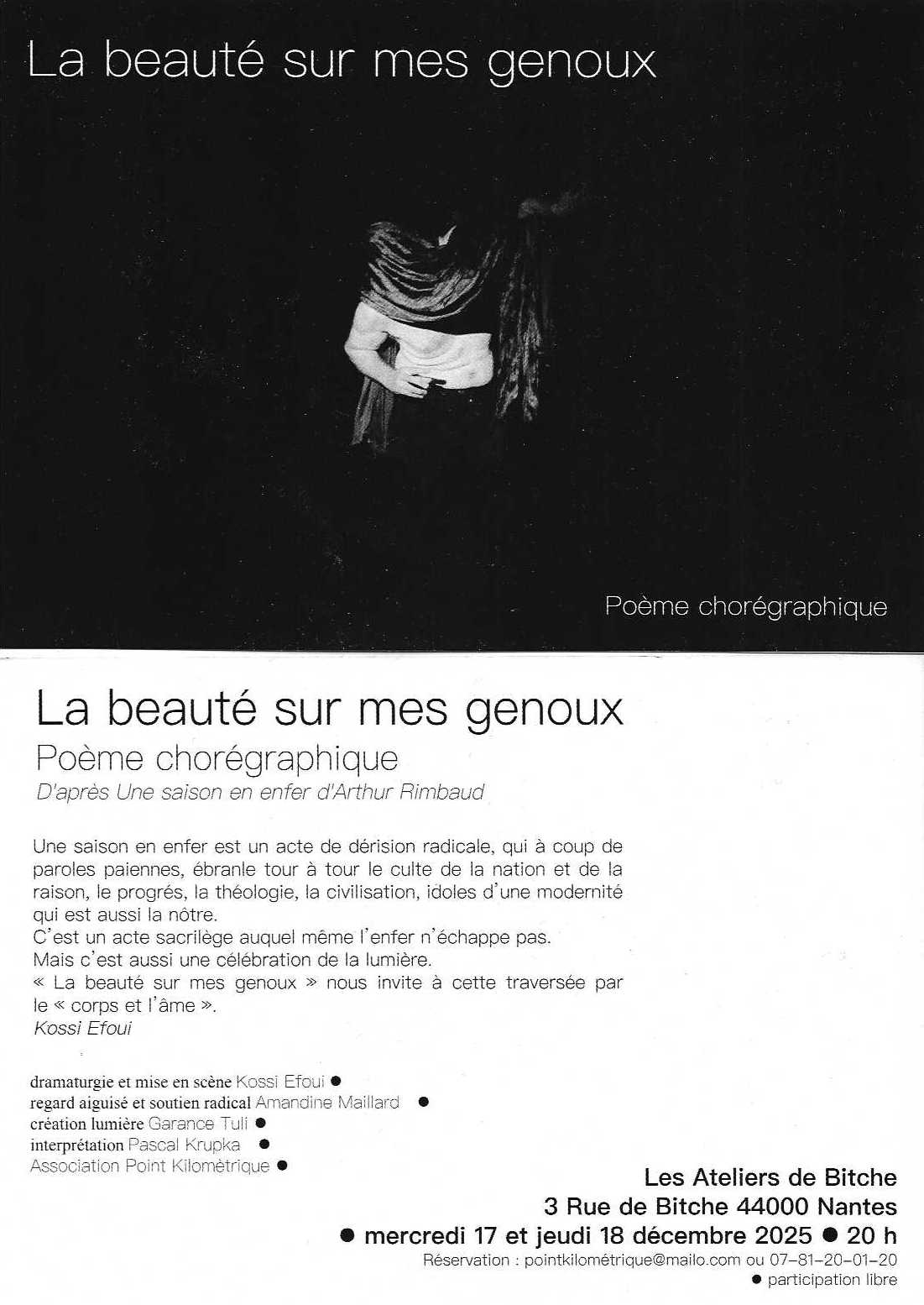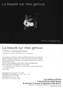 « Tous les événements Cet événement est terminé La beauté sur les genoux – Poème chorégraphique – 17 décembre 2025 de 20 h 00 min à 18 décembre 2025 de 23 h 00 min | prix libre Navigation de l'événement « *+* Festival BiB#4 *+* Salon de micro-éditions - Bonne Impression à Bitche - 𝗦𝗢𝗟 𝗜𝗡𝗩𝗜𝗖𝗧𝗨𝗦 #𝟱 » + Google Agenda+ Exportation iCal Détails Début : 17 décembre 2025 17+01:00 20 h 00 min Fin : 18 décembre 2025 18+01:00 23 h 00 min Prix : prix libre Catégorie de l'événement: THEATRE Organisateur Point kilométrique